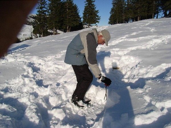 Während der Mittagspause wurden zwei Geräte im Gelände versteckt, damit jeder anschliessend mit seinem eigenen Gerät suchen konnte. Während dieses Vorgangs hatte Sepp unter einer Schneewächte zwei grössere Löcher für einen Rucksack bzw. für sich selbst gegraben. Damit konnte jeder einmal mit einer Sondierstange erfolgreich testen, wie