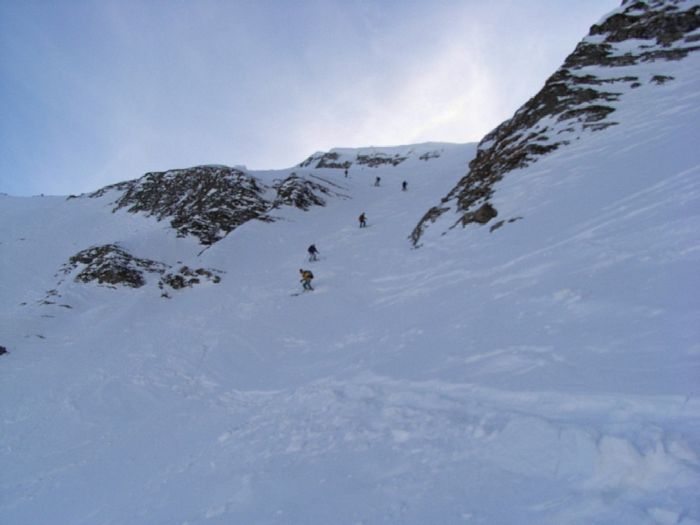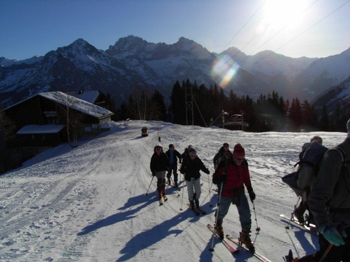 Aus zeitlichen Gründen beginnen wir sofort nach Ankunft um 9.50 Uhr mit dem Aufstieg. Ich entschliesse mich, weil es schon längere Zeit nicht mehr geschneit hat, für den Sommerweg-Aufstieg. Diese etwas ausgesetzte Stelle können wir nur mit geschulterten Skiern passieren. Anschliessend geht es immer dem Waldnacht-Grat nach weiter.