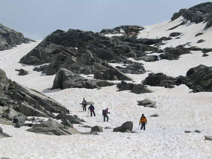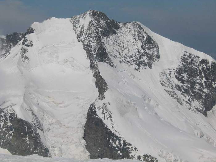 Montag, 19. Juli 2004 Nach einer sehr warmen Nacht starten wir bei bewölktem Himmel um 4.45 Uhr. Es regnet sogar ein paar Tropfen, aber als wir unter der Fourcla Trovat anseilen, reist die Wolkendecke auf und es wird immer schöner mit gutem Blick auf den Palü-Gipfel. Nebst unserer Gruppe sind ca. 50 weitere Personen unterwegs, darum hat es auch eine gute Spur. Der Grat zum Ostgipfel ist mühsam zu gehen, weil die späten Absteiger vom Vortag die Spur kaputt gemacht haben. Kurz nach 9 Uhr erreichen wir den ersten Gipfel (kurze Pause) und 15 Minuten später den Hauptgipfel (3905m). Bei guter Fernsicht gibt es eine Gipfelpause bis 10 Uhr.