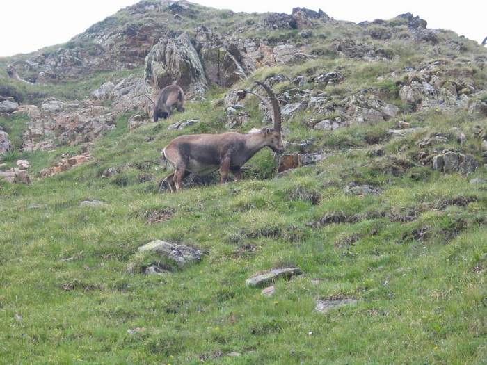 Sonntag, 18. Juli 2004 Trotz unsicherer Wetterlage und einer extremen Gewitternacht in Herisau beginnen wir die Tour nach Ansage. Von Pontresina bringt uns ein Sessellift bis zur Alp Languard (2325m). In 2 ½ Std erreichen wir bei einem Sonne und Wolken-Mix das Gipfel-Restaurant und auch den Piz Languard (3261m). Bis zur Fourcla Pischa queren wir einige Schneefelder. Beim steilen Abstieg ins Val da Fain (Heutal) kommen wir bis auf 10 Meter an eine Steinbock-Gruppe heran, bis ein Warnsignal (Pfeiffen) ertönt. Die Luftseilbahn bringt uns zur Diavolezza (2973m).